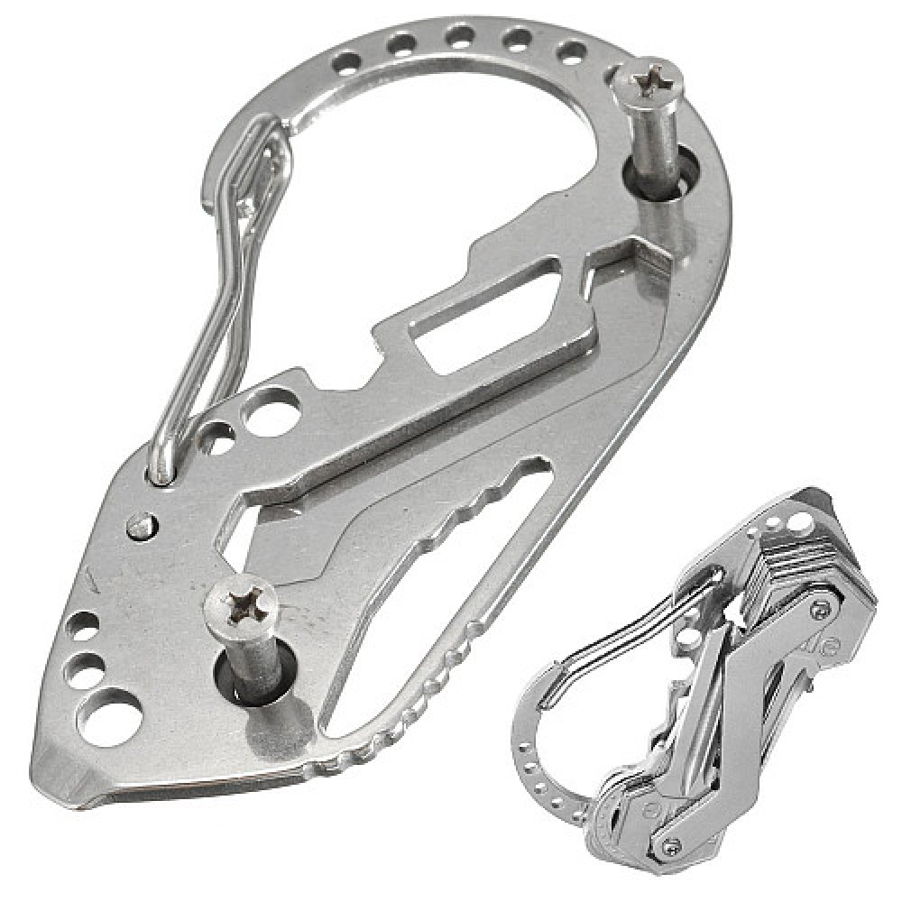 It is a multifunctional device: key ring, carabiner, flat screwdriver, spanner, etc. It is suitable for outdoor sports, hiking, camping, etc.