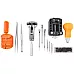 - SPECIFICATION – dimensions (length/width/depth): 20/10/5 cm, weight: 510 g, set includes: adjustable wrench/rotary opener for screw-on bottoms, set of 18 tips for opener/rotary wrench, adjustable holder for attaching watches, 3x bracelet punch 0.70 mm/0.80 mm/1.00 mm, precision tweezers with a pointed tip, set of 3x flat screwdrivers with replaceable blade, tool for removing telescopes, tool for shortening bracelets, knife for prying out watch backs, case.