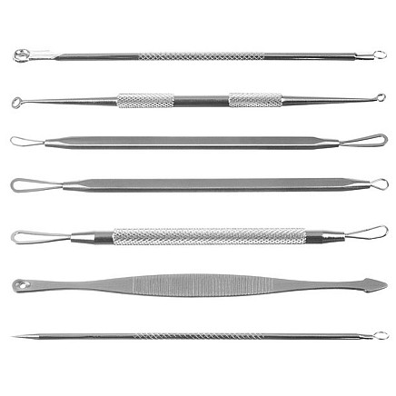- UNIVERSAL - a set of 7 double-sided spoons for safe removal of blackheads, pimples and blackheads. Professional loop spoons are designed for work with blackheads and other facial impurities. They are perfect for removing pimples even from hard-to-reach places.