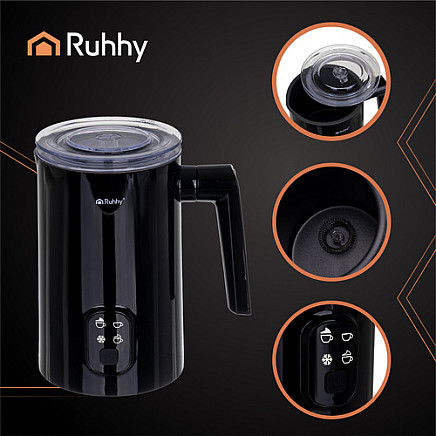 - The RUHHY milk frother is an elegant and functional device that allows you to prepare thick, creamy, café-quality froth in seconds . With two heating modes (65°C and 75°C) and a capacity of 160ml for frothing and 350ml for heating , it's perfect for cappuccinos, lattes, and hot chocolates . Its non-stick coating, simple one-button operation, and 360° swivel base ensure convenience of use and easy cleaning.