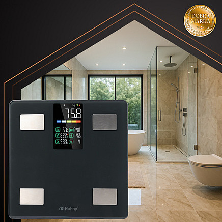 RUHHY Analytical Scale – a modern tool for monitoring your health- advanced body composition analysis – the device not only measures body weight (0.2–226 kg), but also, thanks to BIA technology, analyzes BMI, body fat percentage, body water content, muscle mass, bone mass, visceral fat and other health parameters
