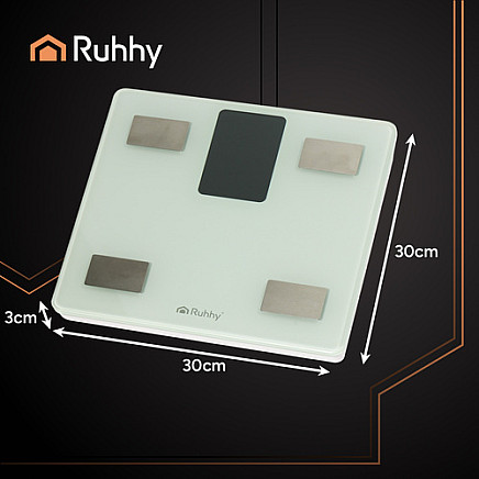 RUHHY Analytical Scale – a modern tool for monitoring your health- advanced body composition analysis – the device not only measures body weight (0.2–226 kg), but also, thanks to BIA technology, analyzes BMI, body fat percentage, body water content, muscle mass, bone mass, visceral fat and other health parameters