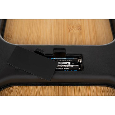 - SPECIFICATION – material: bamboo, others: PP + PVC; weighing unit: kg and lb; minimum weight: 0.002 kg, maximum user weight: 180 kg; display: LCD; automatic shutdown: after 8 seconds; power supply: 2 x AAA battery; battery charge indicator; ambient temperature measurement; dimensions: 28 x 28 x 3 cm; weight: 0.856 kg; weight in packaging: 0.967 kg.