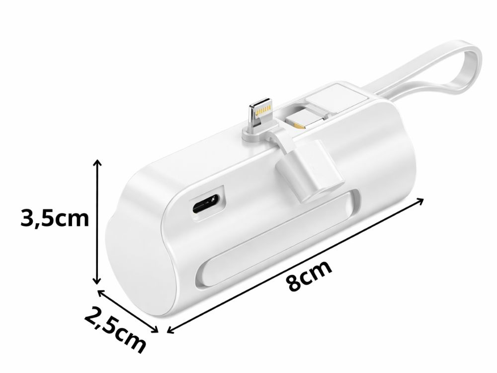A practical 5000 mAh power bank equipped with a built-in Lightning and USB-C connector, allowing you to conveniently charge mobile devices without having to carry extra cables. Its compact design means the device fits easily in a pocket, rucksack or handbag.