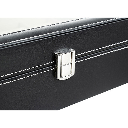 The elegant box has 12 compartments for glasses, watches, and other jewelry. The box has an elegant black color and white stitching, which adds elegance and style to the whole . The lid of the case is transparent, so we can use the watch box not only for storage and keeping order, but also for elegant display of the contents.