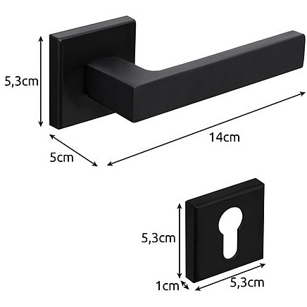 - SPECIFICATION - colour: matt black; material: iron + aluminium; for doors: internal; handle dimensions: 5.3 x 5 x 14 cm; rosette dimensions: 5.3 x 5.3 x 1 cm; weight: 440 g; weight in packaging: 486 g.