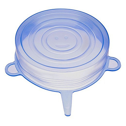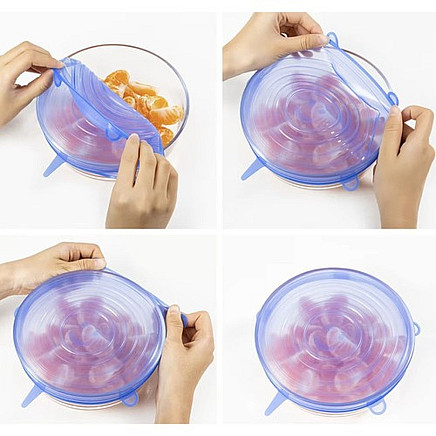 A set of lids made of silicone, adapts to various types of cookware, copes with any type of material (glass, porcelain, steel, plastic, etc.). Each lid is equipped with 4 special ears and a tail at the edge. By pulling on the ears, we can pull the lid tightly onto the vessel. The tail, on the other hand, will make it easy to remove the lid.