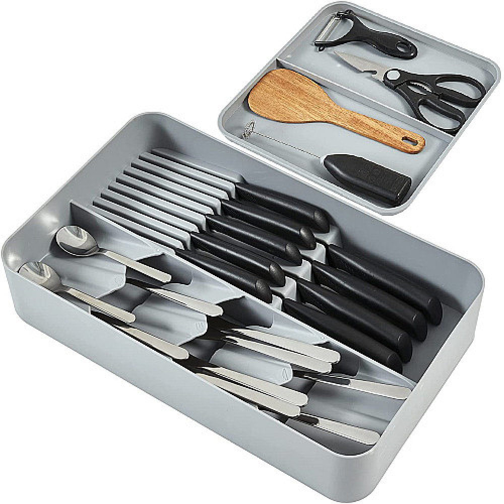 With the cutlery organiser you will be able to keep your knives, forks, spoons and other kitchen ut ensils in perfect order. You will no longer waste time searching through your drawer for the right cutlery.