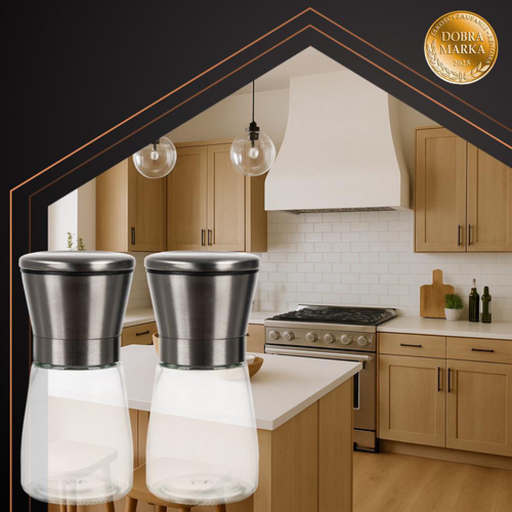 Choose style and functionality with modern RUHHY grinders. Made of transparent glass and finished with a metal lid, allow you to control the amount of spices and at the same time they look elegant in any kitchen. The ceramic grinding mechanism ensures precise, manual grinding and unleashes the full flavor of every dish. This practical and stylish set is perfect for both everyday cooking and elegant table settings – because true flavor begins with freshly ground spices.