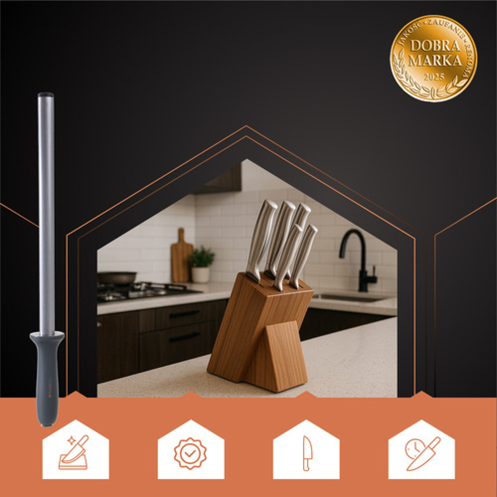 Musak diamond is an irreplaceable tool for regular knife sharpening – it ensures that they are sharp as if they were just leaving the factory. The diamond surface guarantees effective, fast and even sharpening without damaging the blade. The ergonomic handle and steel rod make the whetstone comfortable and durable – ideal for professional and home kitchens.