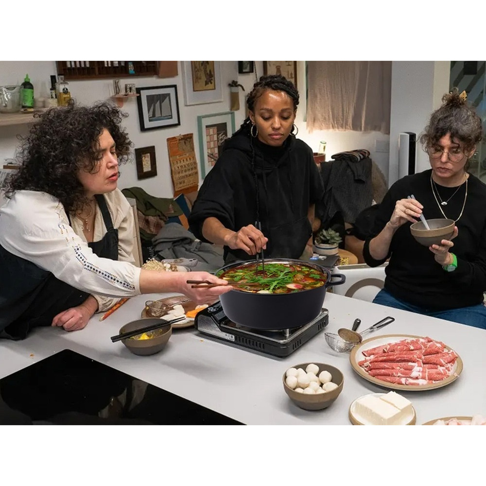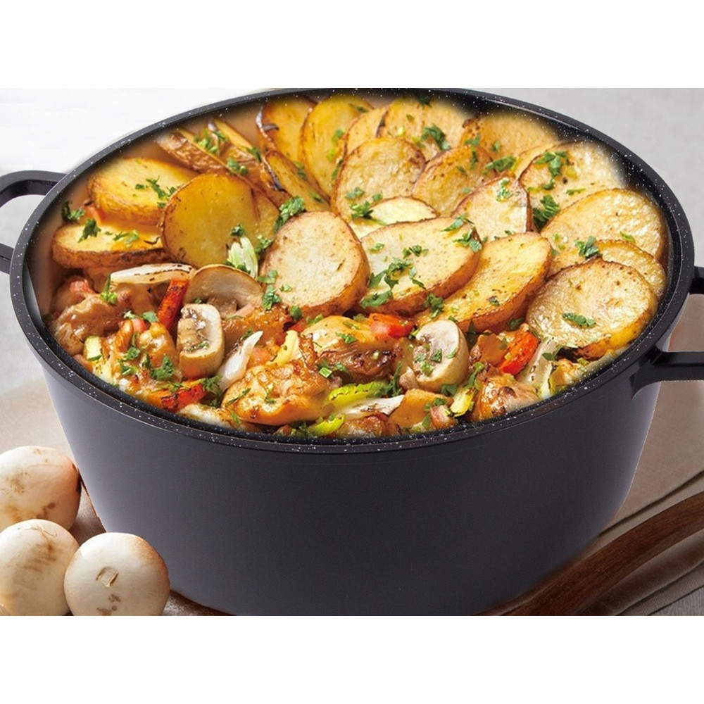 The pot is made of high-quality aluminium alloy that has been pressure-cast. It is lightweight yet strong and conducts heat efficiently. This makes it ideal for cooking food on various types of cookers, including induction cookers.