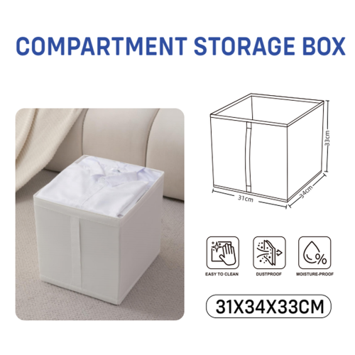 This practical storage box is the perfect solution for organising space at home. Thanks to its universal size of 31x34x33 cm, it is ideal for storing clothes, accessories, documents, toys and other items.