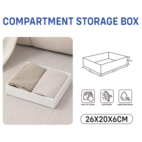 We present a practical and aesthetically pleasing organiser measuring 26x20x6 cm, which will help you keep your drawers, shelves or wardrobes tidy. Its universal design makes it ideal for storing a variety of items such as underwear, socks, accessories or cosmetics.