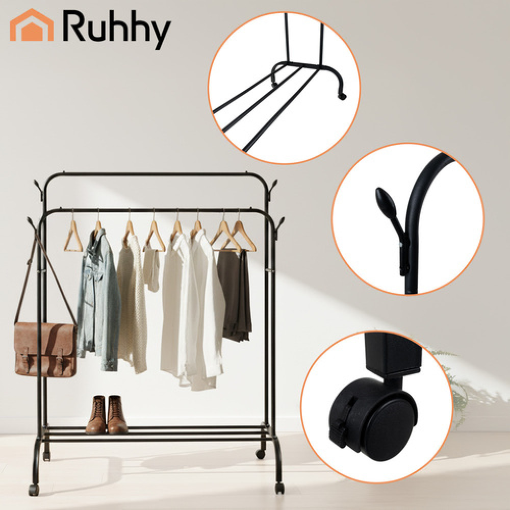 Looking for a clever way to organize your wardrobe, hallway, or office? The Ruhhy double coat rack provides ample space for clothing and accessories, and thanks to its locking casters, you can easily move it wherever you need it. Its sturdy construction with an iron frame and a practical lower shelf ensures your clothes are always within reach and in perfect condition.
