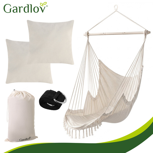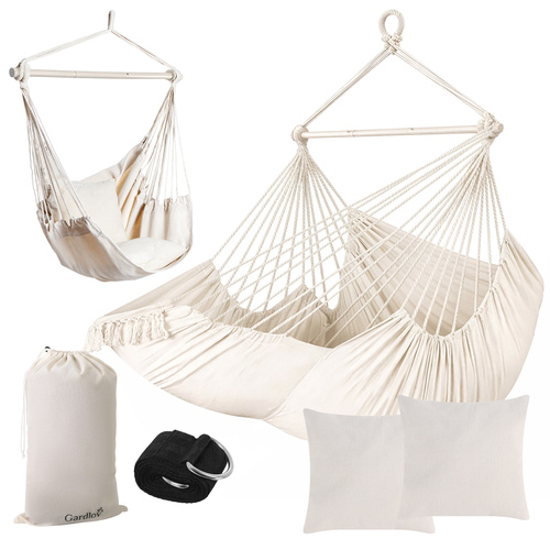 The Brazilian Gardlov hanging chair is a large, comfortable   A garden and balcony hammock that will transform an ordinary corner into a cozy relaxation zone in a matter of moments . The enveloping, strong cotton fabric, two soft cushions, and a stable metal bar ensure comfort and safety.   an ideal place to relax after work, read a book or take a moment to unwind in the garden, on the terrace or in the living room .