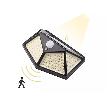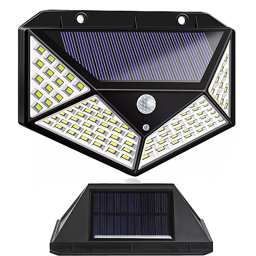 The solar lamp is a solar-powered device which guarantees illumination without an additional power source. It is equipped with a very bright panel of 100 LED points with a strong light output and a movement sensor.
