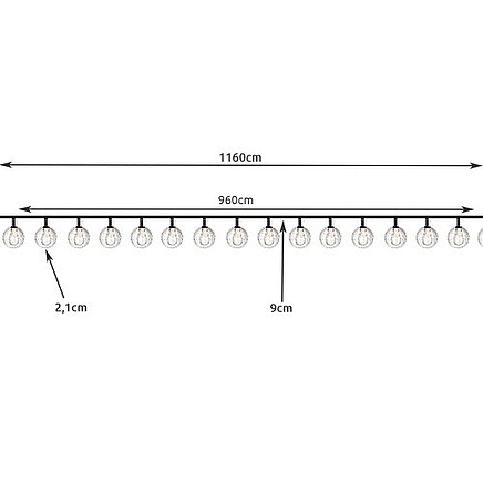 - Warm Yellow Light The balls in the garland emit a warm white color of light, which makes them ideal for creating atmospheric lighting. Each ball is placed 9 cm apart, which ensures even distribution of light along the entire length of the garland. The well-thought-out design of the garland is complemented by a 1160 cm long cable in dark green, which perfectly blends into the surroundings, becoming almost invisible against the background of vegetation, allowing you to focus all attention on the glowing balls.