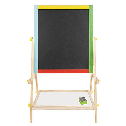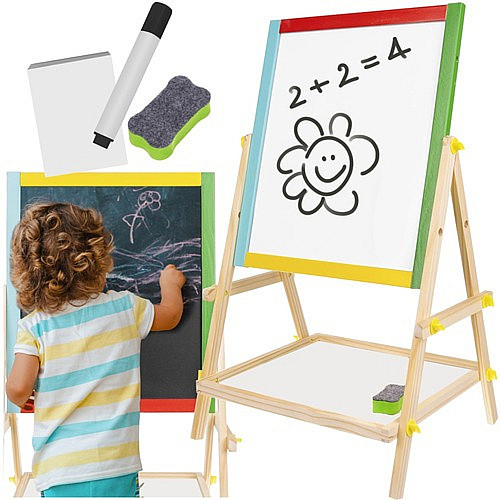 double sided - two different usable surfaces: a black chalk side for drawing with chalk and a white dry-erase side, ideal for writing with markers, children can use a variety of creative techniques, developing their creativity and skills in play and learning