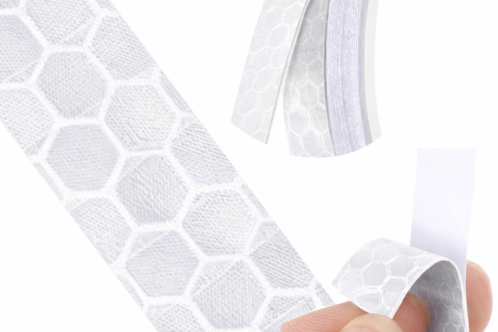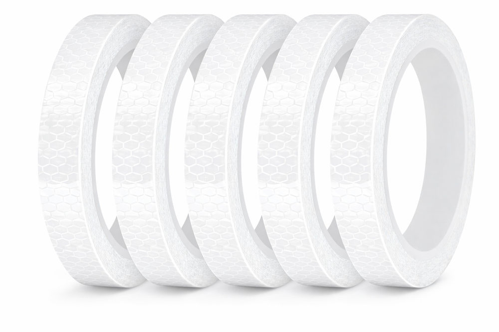 The flexible structure allows the tape to be adjusted to wheel rims, frames, helmets and other curved elements.