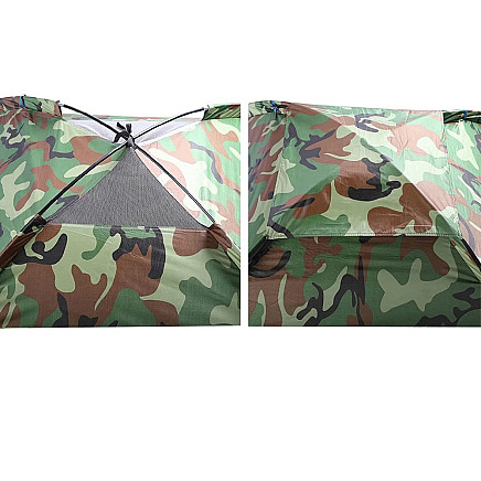 This spacious and practical camping tent in camouflage colour is a great choice for a couple, three friends or a family with a child. It provides enough space to relax, and its compact design is perfect for camping, campsites, festivals or tent holidays. The camouflage pattern allows it to blend in with its natural surroundings.