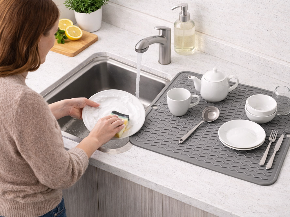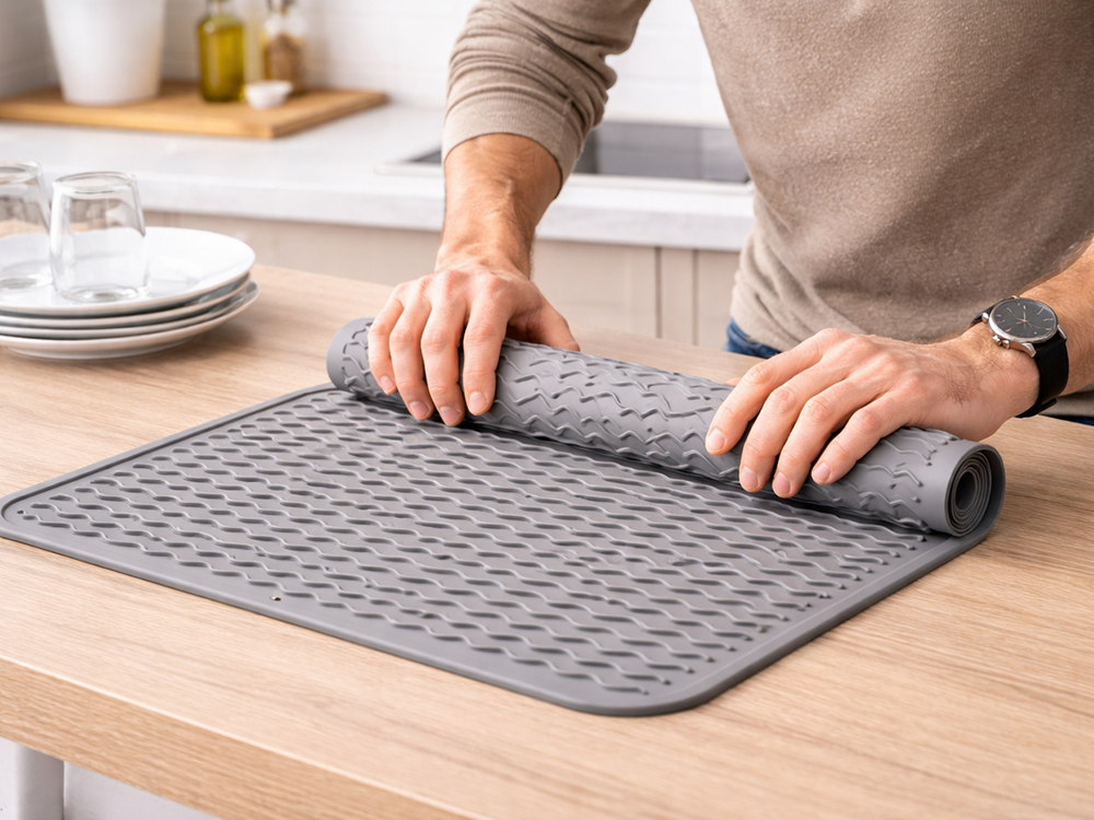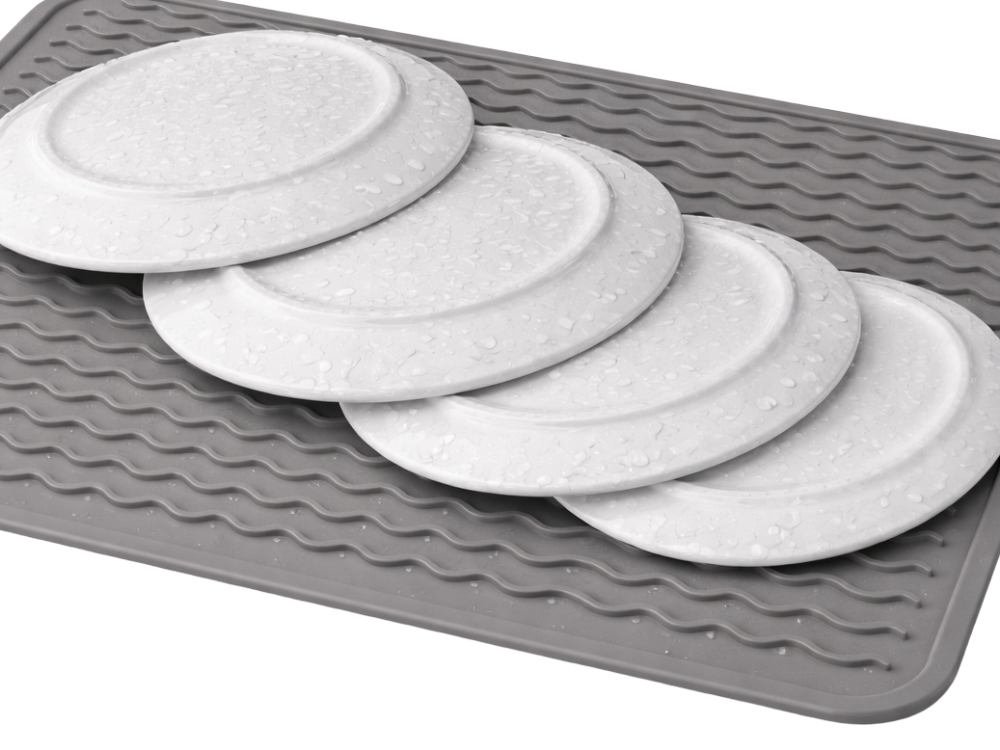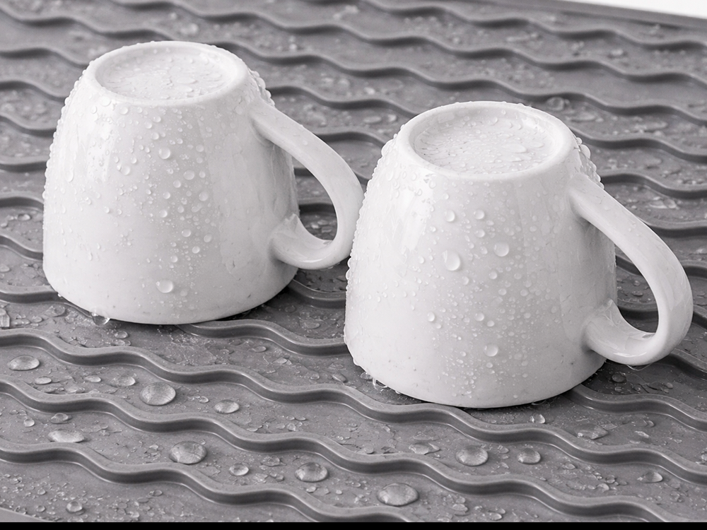 A MODERN SILICONE DRYING MAT INSTEAD OF A TRADITIONAL DISH RACKA silicone drainer is an excellent alternative to classic dish racks. It protects the worktop from water, water marks and scratches, whilst ensuring hygienic drying of plates, cups and cutlery. Water flows freely between the grooves, preventing it from accumulating and causing unpleasant odours.