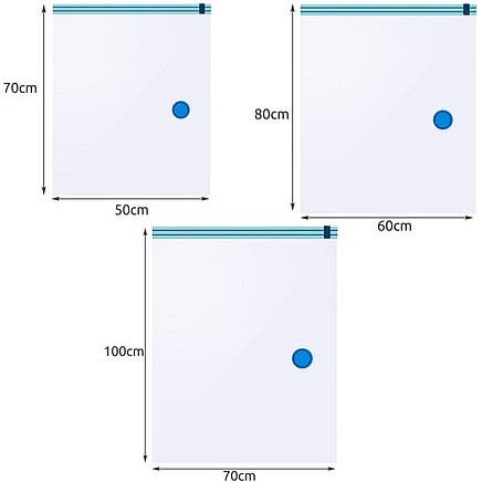 - SPECIFICATION – material: PA, others: HDPE + silicone; colour: transparent / blue; dimensions: (width/length) 50x70cm – 5 pcs; (width/length) 60x80cm – 5 pcs; (width/length) 70x100cm - 5 pcs; weight: 1.242kg; weight in packaging 1.442kg.