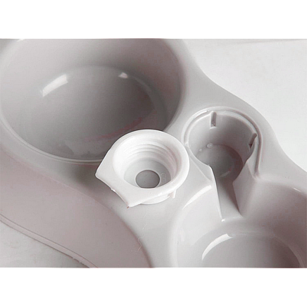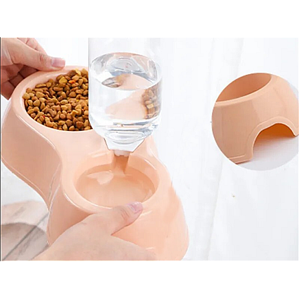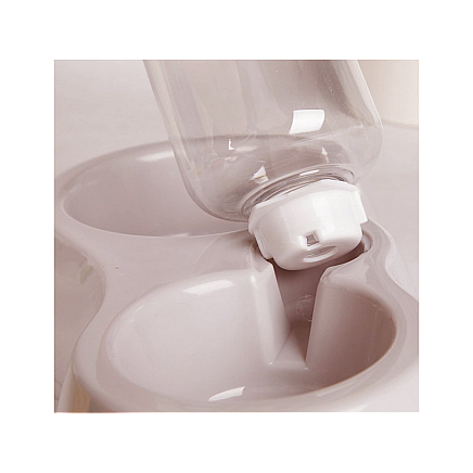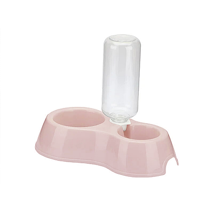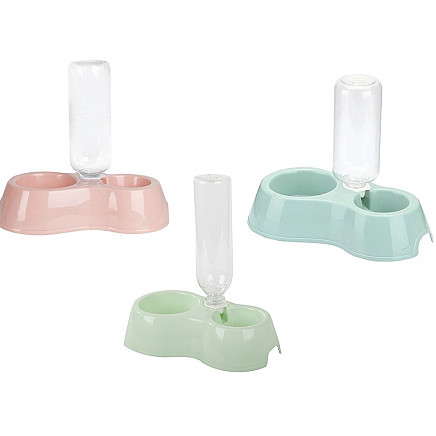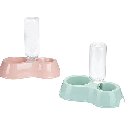 A double plastic bowl with a practical water dispenser ensures that fresh water is always available for our pet when the household is away for long periods of time.