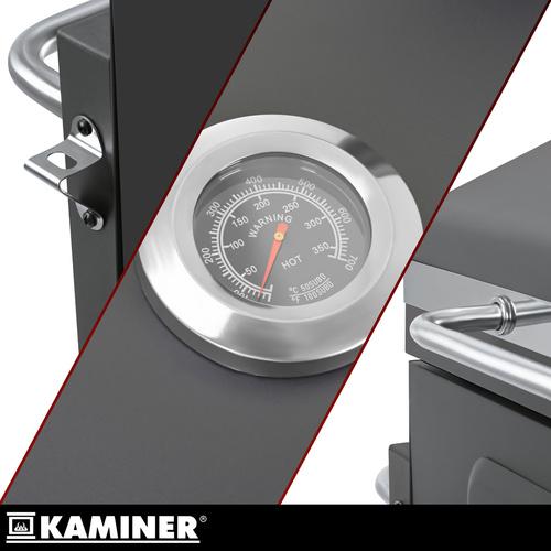 Garden charcoal grill with cast iron grate, chimney with cover, ash pan + thermometer Polish brand KAMINER - the highest quality grill KAMINER garden charcoal grill with a cover, thermometer, 3-piece cast iron grate, enameled