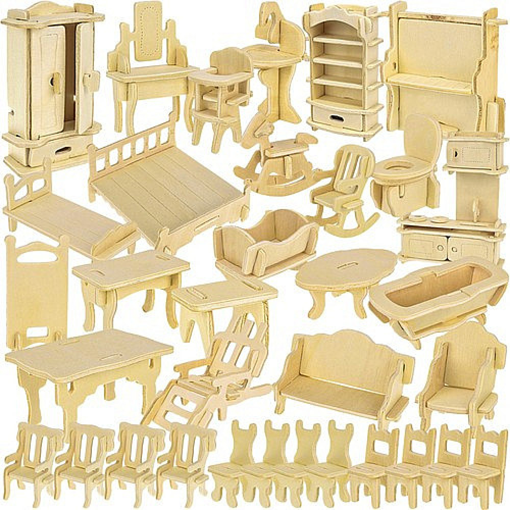 Set of 34 pieces of furnitureThe set includes 34 pieces of furniture for self-assembly. Some of the furniture contains movable elements, e.g. opening doors in the wardrobe. The furniture will be a complete equipment for every dollhouse. The set consists of: