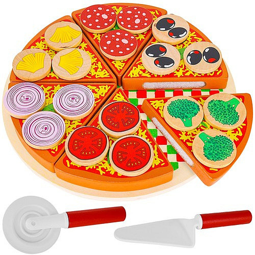 - INCLUDED - the set includes as many as 27 elements: a stand, 6 pieces of pizza, a spatula, a knife for dividing the dough, and 3 pieces of pineapple, onion, tomato, broccoli, olives and salami. The whole thing was made of high-quality wood painted with a special paint that is not harmful to health . In addition , it has Velcro that allows you to cut the pizza and put it back together after playing .
