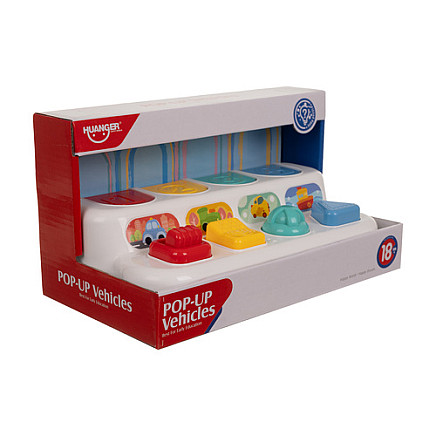 Educational toy with pop-up vehicles, jumping POP-UP cars, interactive 4-in-1 vehicles + pop-up cars, set with mechanisms and buttons for children 18 m+!