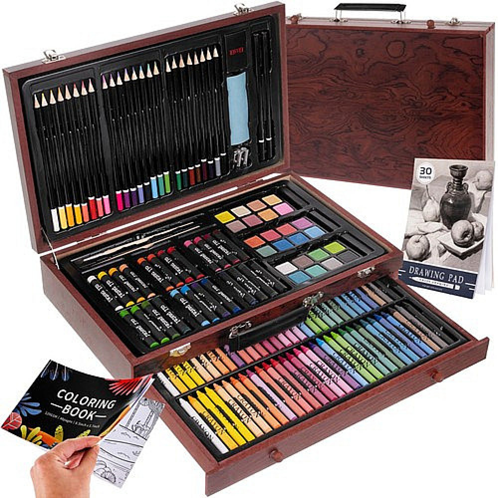 - PRAKTISKAIS SUITCASE WITH DRAWER - bērnu mākslas komplektam ir praktisks koka čemodāns ar aizdari un rokturi. Tas padara koferīša saturu ērtu un ļoti vienkāršu transportēšanu.