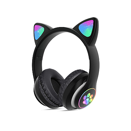 The headphones feature a very fashionable LED backlight in the shape of cat ears. There is a cat's paw pattern on the headphones, also backlit in RGB colours.