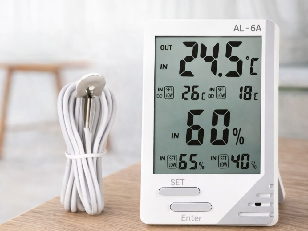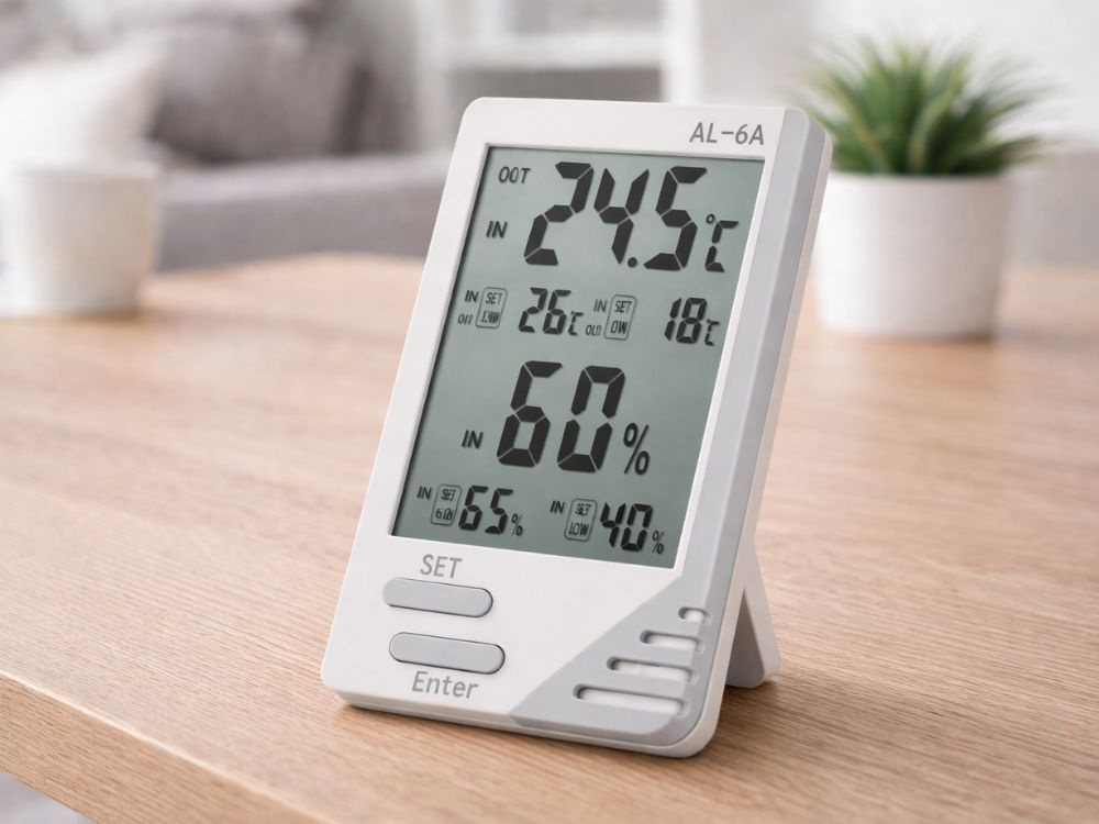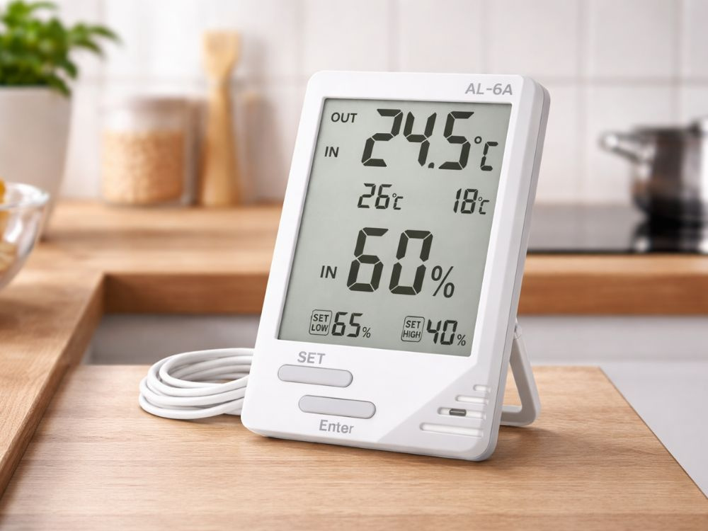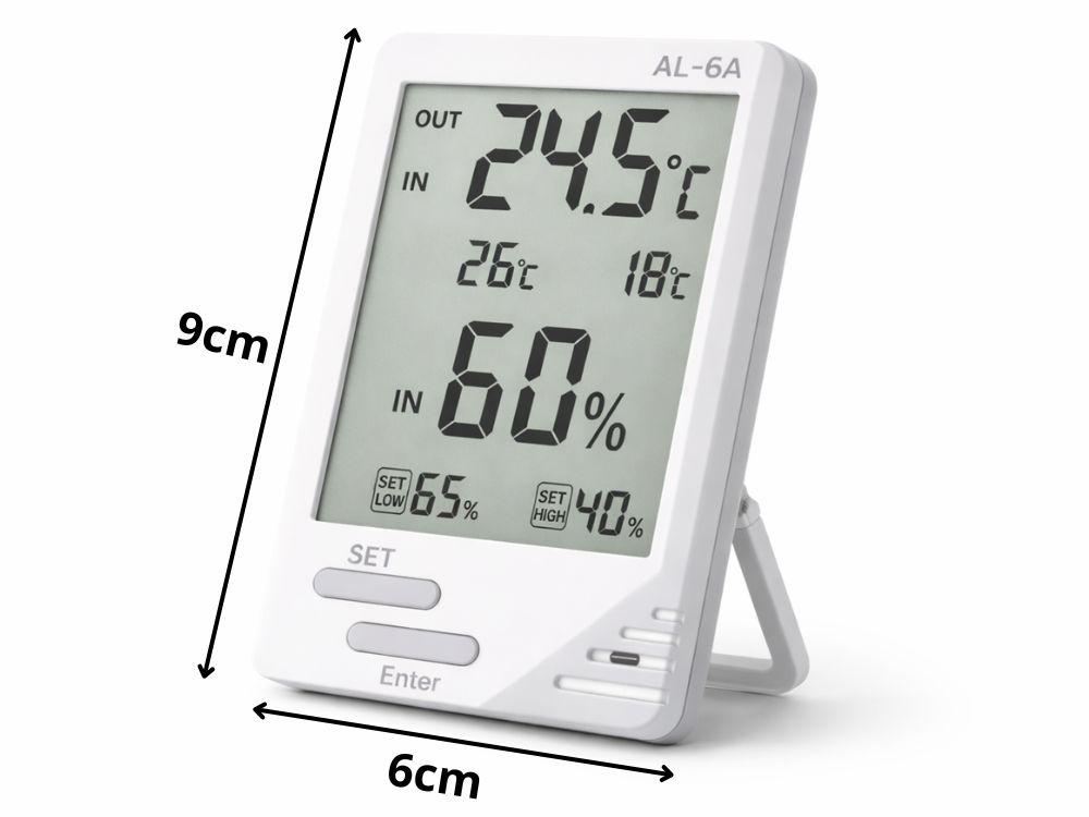 GAISA MITRUMU KONTROLEIebūvētais higrometrs ļauj uzraudzīt mitruma līmeni telpā. Tādējādi jūs viegli uzturēsiet atbilstošus apstākļus augiem, dzīvniekiem, uzglabājamajiem produktiem vai mājsaimnieku komfortam.