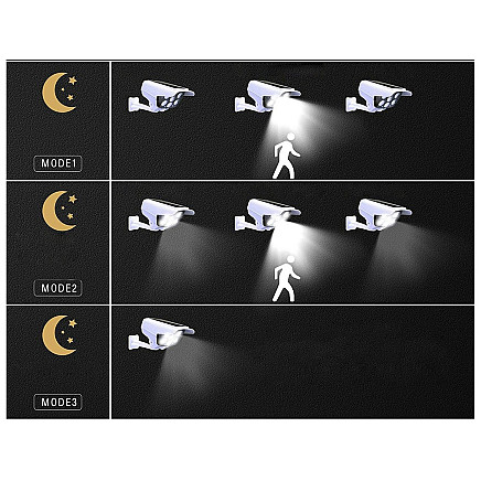 2. the LEDs in the camera light up at 50% of their power all the time, when motion is detected they switch to 100% of their power, when there is no motion, the camera returns to standby mode and lights up at 50% of its power. Automatic switching on at dusk and off at dawn.
