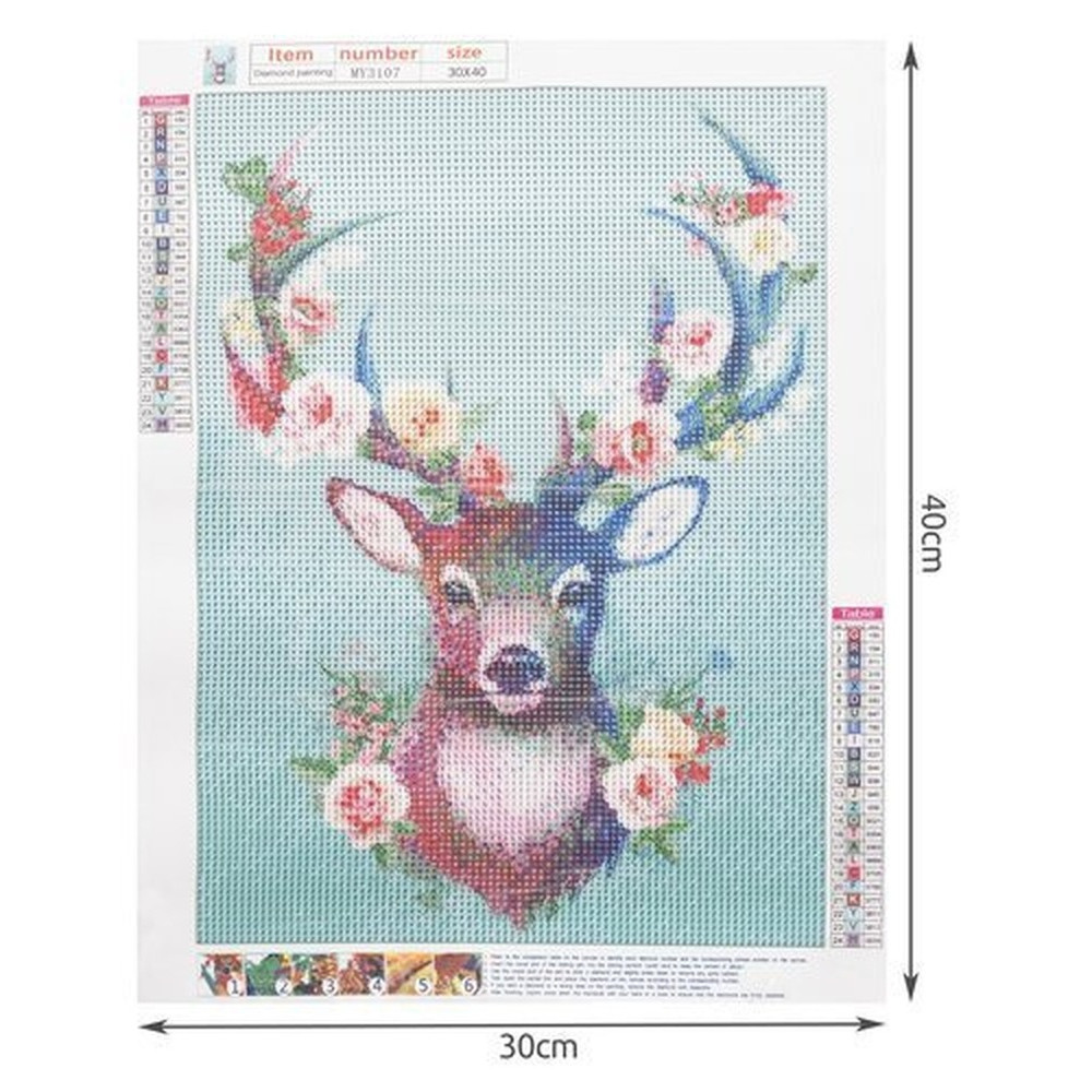 - SPECIFICATION – pattern: deer; canvas covered with an adhesive layer: yes; in the set: colored diamonds, applicator, dry glue, container; dimension: 30x40 cm; picture size: 25x35cm; weight: 0.1 kg; weight in the package: 0.103 kg