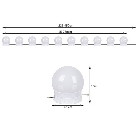 - SPECIFICATION: convenient control panel: yes, on the cable; possibility of sticking to a mirror: yes; light colour: warm, neutral, cold; material: PC, others: ABS + PVC + set of self-adhesive stickers; light shades: 3; intensity levels: 11; total number of modes: 30; USB power supply; power: 6W; voltage: 5V; total cable length: 4.5 m (including 2.7m cable with lights); adjustable cable length between lights: up to 25cm; bulb dimensions (width / height): 4.5 x 5 cm; weight: 0.15kg; weight in packaging: 0.236kg.