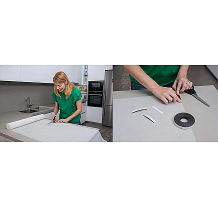 It is made of polyester. It can be washed, ironed and cut to any size.