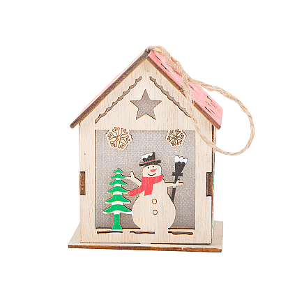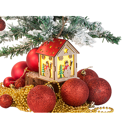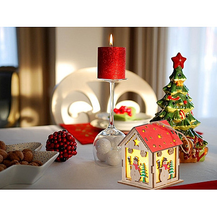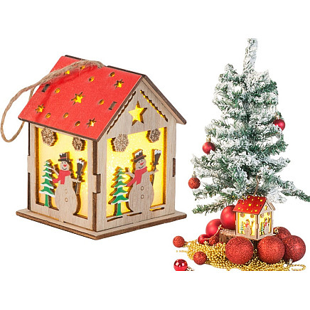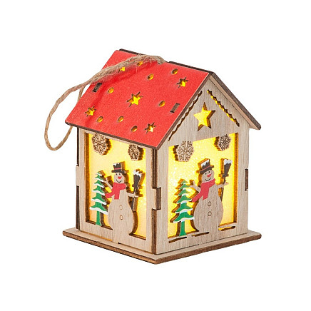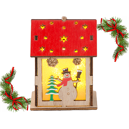 Izgatavots no dabīga koka, laternai ir smalki zvaigžņu formas izgriezumi un svētku motīvi, piemēram, sniegavīrs un Ziemassvētku eglīte. Tās iekšpusē ir LED apgaismojums, kas smalki izgaismo rotājumu, radot siltu, mājīgu atmosfēru.