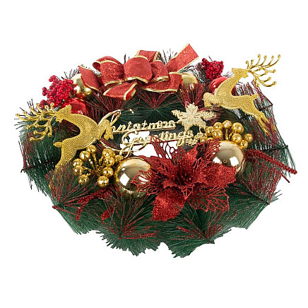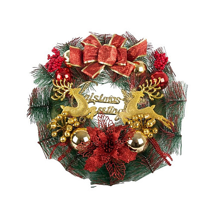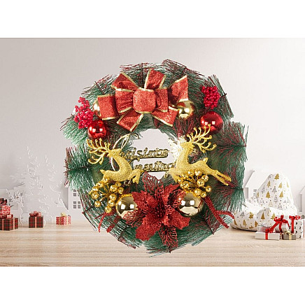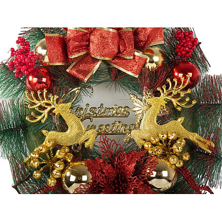 Vainags ir izgatavots no augstas kvalitātes priežu zariem (mākslīgiem, reālistiskiem), dekorēts ar bumbulīšiem, mākslīgiem ziediem, ziemeļbriežiem un lielu Ziemassvētku apsveikuma zīmi.
