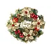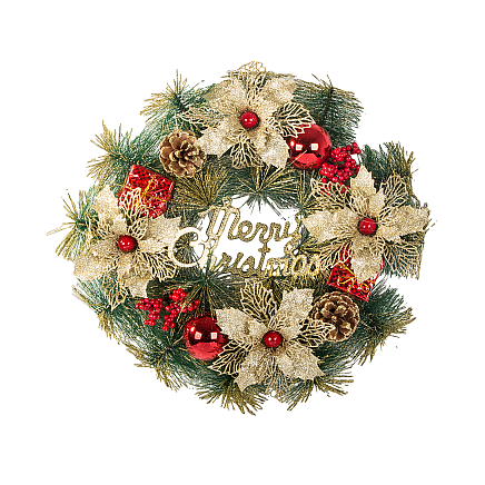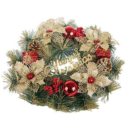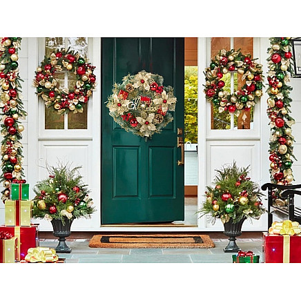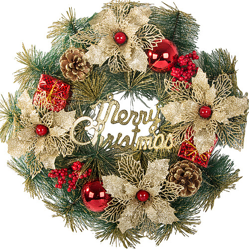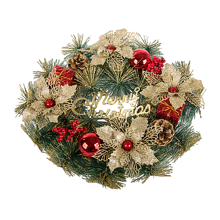 The wreath is made of high-quality pine branches (artificial, realistic, gilded), decorated with natural pinecones, baubles, gifts, artificial flowers and a large Merry Christmas sign.