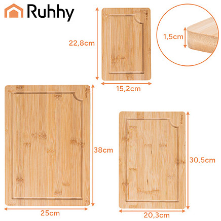 The most important advantages of the Ruhhy bamboo board set- 3 boards in different sizes (38x25cm; 30.5x20.3cm; 22.8x15cm) – thanks to them, you'll always find the right surface for your ingredients. If you're worried that one board for everything will quickly wear out or be uncomfortable, a set of three solves that problem – you have separate boards for meat, vegetables, bread, and fruit.