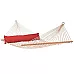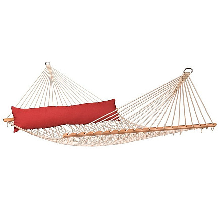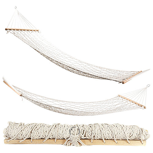 It is made of sturdy woven mesh-type cord, just like thickly woven cords. All this makes the hammock durable and air permeable, so it will be very pleasant to use. It has been reinforced with two wooden crossbars, making it stable and making it easy to get in and out of the hammock.