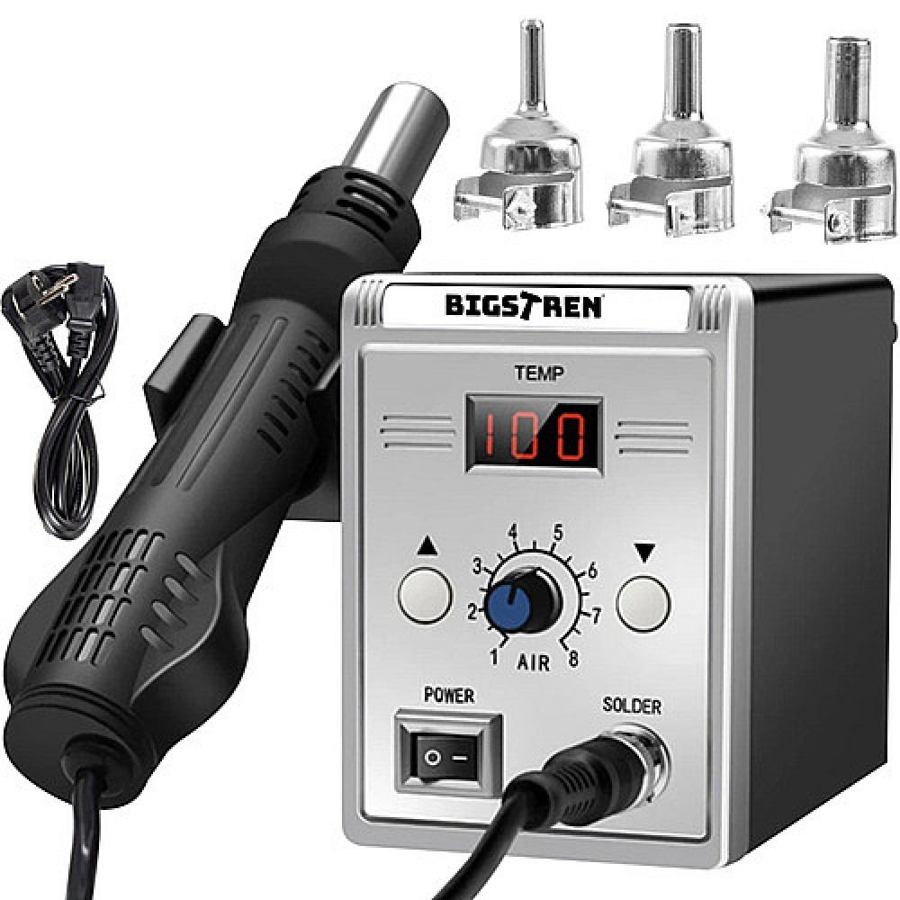 - SPECIFICATIONS - material: iron, others: ABS + stainless steel + rubber; LCD display; power: 700 W; voltage: 220V; operating temperature: from 100 to 500 degrees Celsius; maximum air volume 120 l/min; ceramic heating core; stock length: 24 cm; station dimensions: 9.5 x 15.5 x 13 cm; weight: 0.998 kg; package weight: 1.243 kg.