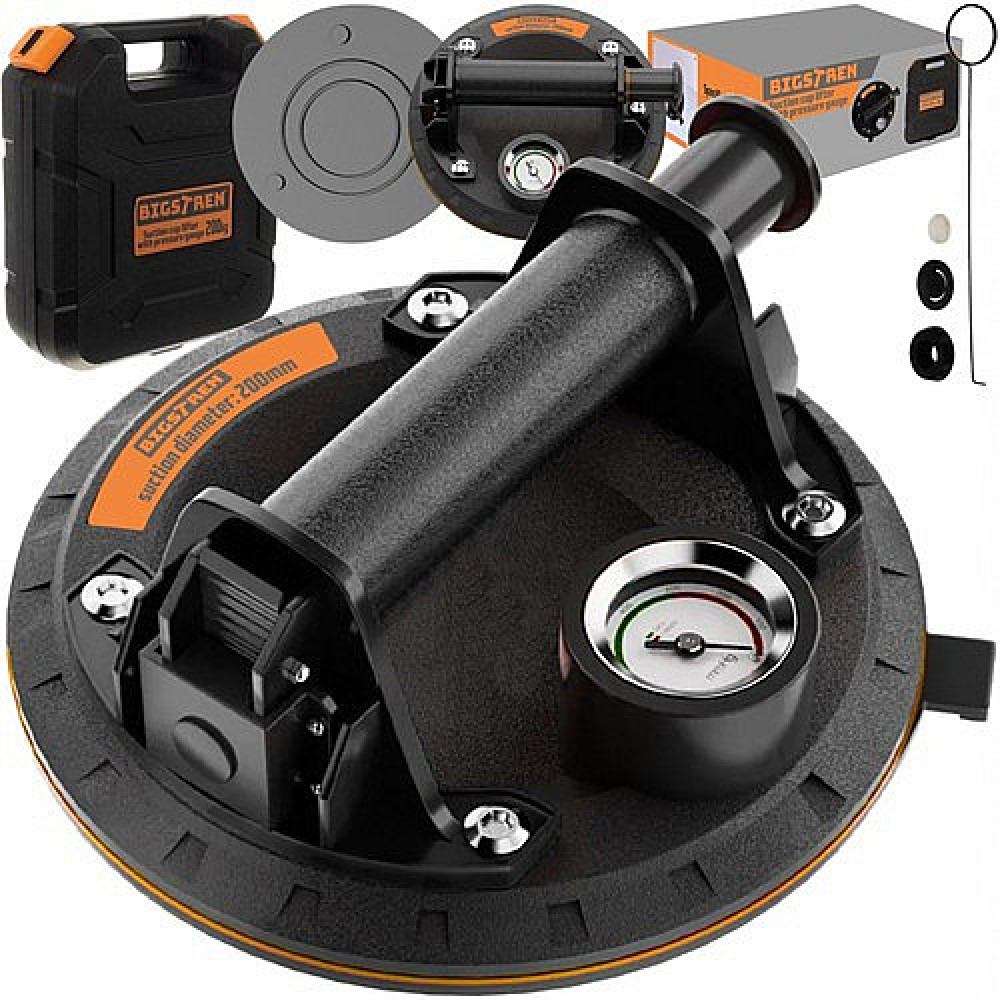 - SPECIFICATIONS - black colour; material: nylon, others: rubber + silicone + iron) + suitcase (polyethylene) non-slip handle: yes; load capacity: 200kg; pressure gauge: 0-760 mmHg; suction cup diameter: 200mm; double-layer suction cup; material: body durable ABS plastic + rubber suction cup; dimensions: 20 x 20 x 9 cm; suction cup weight: 1.051 kg; package weight: 1.921 kg