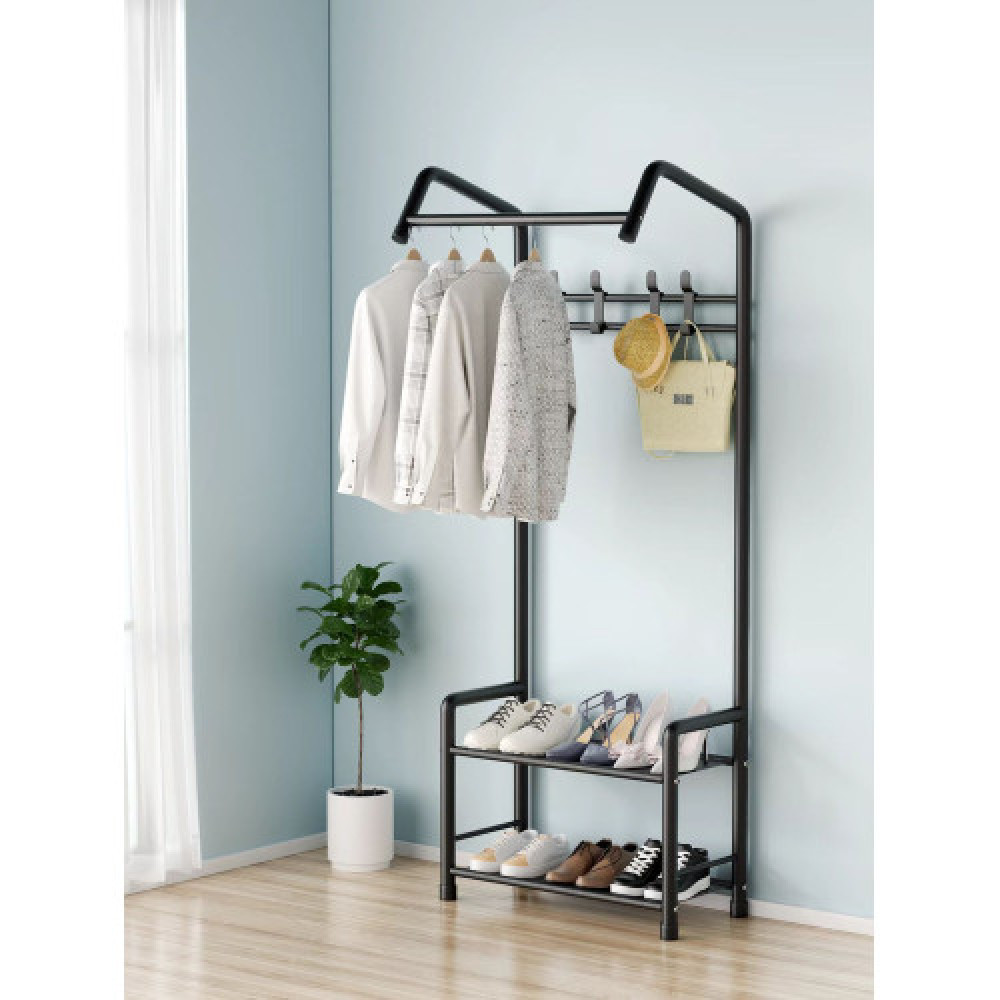 Stāvamais drēbju statīvs ar āķiem un 2 plauktiem apaviem