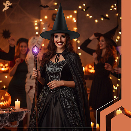 A classic witch hat in deep black is the perfect complement to witch, fairy, magician or fantasy character costumes. The conical shape and wide brim create a striking effect that attracts attention and adds a unique touch to any outfit. The hat is lightweight, comfortable, and versatile. It's perfect for Halloween, costume parties, performances, photo shoots, and themed events.