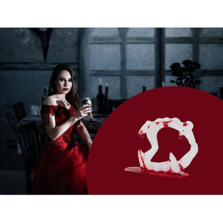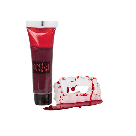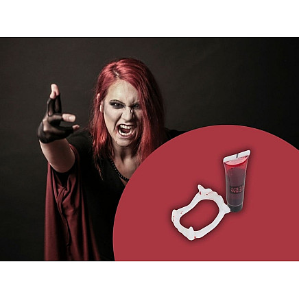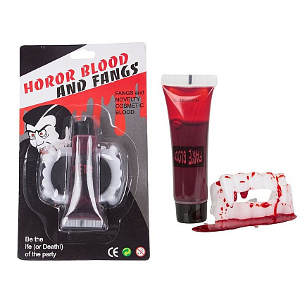 This set consists of fake teeth and a tube of fake blood, perfect for completing your Halloween costume. The teeth, in the form of Dracula's vampire fangs , are perfect for recreating the vampire's distinctive, menacing look.