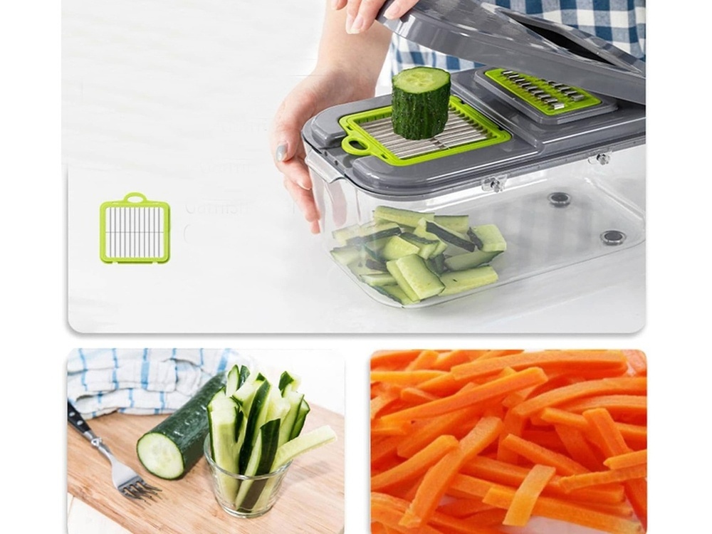 ? Slices vegetables, fruit, eggs, cheese and many other foods into cubes, strips, bars, slices.
