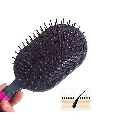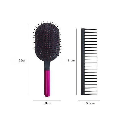 Praktiskais komplekts, kas sastāv no masāžas matu sukas un ķemmes, ir ideāls risinājums tiem, kuri vēlas rūpēties gan par matu veselību, gan par galvas ādas komfortu. Birste ir aprīkota ar mīkstiem un elastīgiem zobiņiem, kas maigi masē galvas ādu, stimulējot asinsriti un veicinot veselīgu matu augšanu. Tajā pašā laikā tā efektīvi atšķetina matu šķipsnas, neradot matu lūšanu vai noplūkšanu.